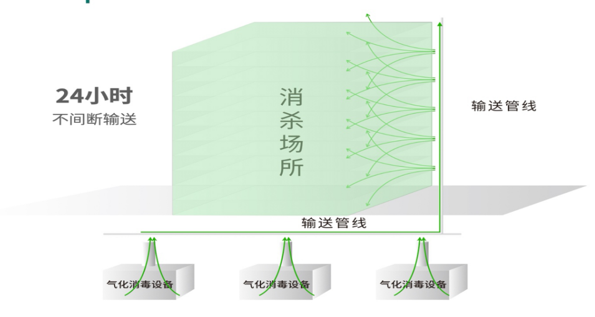 通過管道的輸送方法,確保一臺(tái)機(jī)器無死角消殺范圍達(dá)250-300平方米,管道可視場地需求通過軟管和硬管兩種不同輸送方式。