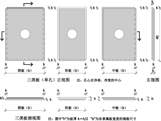 附圖說明:上圖為坎式模板之中的單孔模板,除此之外還有“單排2 孔、3 孔、4 孔”及“雙排4 孔、6 孔、8 孔”等未在圖示之內(nèi)。由于模板邊緣坎的分布位置不同造成模板的兩個(gè)面尺寸會(huì)不相同,圖中把“雙面”模板中的設(shè)定的規(guī)格尺寸面用淺灰色表示(標(biāo)色),這其中中板寬度的兩個(gè)面均與規(guī)格尺寸同(只是板兩面成對(duì)角菱形斜槎)均用“淺灰”色(標(biāo)色);陰板非規(guī)格面比規(guī)格尺寸小的模板面采用“深灰”色(標(biāo)色);陽板的非規(guī)格面比規(guī)格尺寸大的模板面采用“乳白”色(標(biāo)色)。圖中“h”表示為模板厚度,“k”表示為坎式邊緣的寬度及厚度,k=h/2(二分之一板厚);“b”為各隸屬板寬度的規(guī)格尺寸。