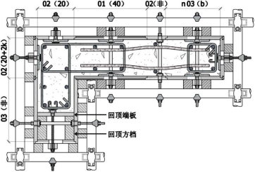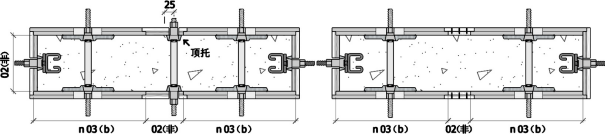 [注]:圖中表示方式及拼模時(shí)應(yīng)注意的事項(xiàng)同前,縱向“03(非)”段,所采用的“體外對(duì)拉”及“單邊拉結(jié)”均按照“自制板”應(yīng)采用“頂托”替代“內(nèi)頂蓋”,“單拉錨固”螺桿適用于柱端砌墻段,可方便安裝墻體拉結(jié)筋(參見上圖)。橫向“陰陽面”采用“02(非)的組合,當(dāng)“02(非)”寬度大于 10cm 時(shí)需設(shè)置對(duì)拉螺桿。圖中其他表示方式及拼模方法同前,其中括號(hào)內(nèi)的“40”“20”為隸屬序號(hào)板的具體規(guī)格(厘米),“20+2k”表示為“加碼面”尺寸。