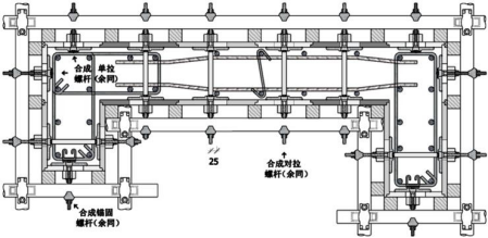 用“單邊拉結(jié)”同樣能起“連接”作用(見圖左、右兩上角),使“小規(guī)格”得以很好拼模。圖中還展示了“擴(kuò)展型穿螺桿孔”螺桿可向“孔”中心側(cè)移(最大25mm)能避開直徑30mm之內(nèi)的所有豎向鋼筋。另外,墻板陰角模板尺寸較小時(shí)(一般陰板的設(shè)置不小于30cm、中板不小于25cm)。