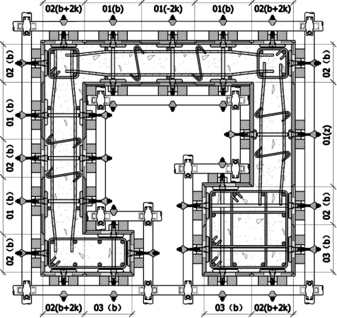 圖中寬度標(biāo)注中的序號(hào)“01”、“02”、“03”分別代表“陰板”、“陽板”、“中板”,括號(hào)內(nèi)的“b”表示為隸屬于序號(hào)板的所有寬度規(guī)格尺寸,其中“b+2k”表示為陽板的加碼面,“b-2k”表示為陰板的減碼面,“01(z)”表示為陰板的自制(非標(biāo)規(guī)格仿制)板。上圖采用了縱向(y 軸)“規(guī)格面對(duì)齊”區(qū)段統(tǒng)一;橫向(x 軸)“其他面入槽”區(qū)段統(tǒng)一。“區(qū)段統(tǒng)一”是指一個(gè)相對(duì)獨(dú)立的區(qū)段,這個(gè)區(qū)段如果是在地下室(含外墻板)就會(huì)相當(dāng)大,可以依后澆帶為界,也可以通過設(shè)立“非標(biāo)準(zhǔn)”段來劃分,施工時(shí)需要協(xié)調(diào)。