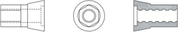 說明:圖左為“錐頂螺母”主視圖,中為側(cè)視圖,右為剖視圖,“錐頂螺母”一端為外六角,中間段為圓柱,另一端為錐面體(中間凹槽內(nèi)設(shè)橡膠墊片),整個(gè)中心是“T12內(nèi)螺紋”(可以擰在螺桿上)。