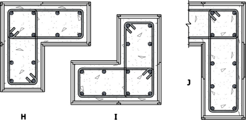 圖 H、I 主要為單塊中板完成的“L”形柱陰陽面段的拼模,由于中板兩面均為“規(guī)格面”在拼模時(shí),只要是選擇了橫(x)向“規(guī)格面對(duì)齊”,那么縱(y)向的中板就“入槽”;其中 H 圖采用了橫向?qū)R,I 圖采用了縱向。