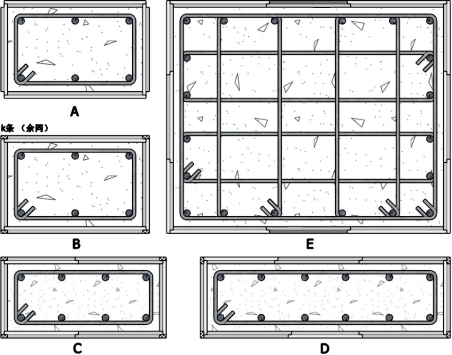 圖 E 為陽板的“替代擴(kuò)延”來完成較大尺寸矩形柱的拼模,其中橫(x)向采用“標(biāo)碼替代”(組合標(biāo)碼)“規(guī)格面對(duì)齊”,縱(y)向采用“加碼替代”(組合加碼),對(duì)入角部 90o相交板的坎槽中。