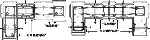 (2)雙拆條件”:當(dāng)“依次拆?!钡疥幗菚r(shí),組成陰角(90o)的兩塊模板在寬度方向同時(shí)均有可向“側(cè)邊”移動(dòng)的“空間”(見之下的“可向側(cè)邊移動(dòng)”參考圖)。
