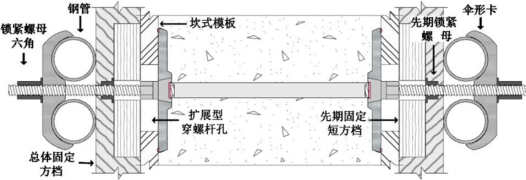墻板拐角橫向或縱向螺桿均有發(fā)生“碰撞”概率。所以在固定位穿螺桿孔孔徑設(shè)置時(shí)采用了“擴(kuò)展孔”孔徑設(shè)定為 7.5cm,在體系其他構(gòu)件的協(xié)同下可避免上述兩種“碰撞”。