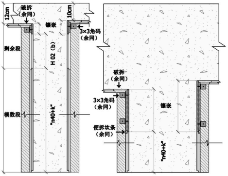 當(dāng)高度拼模到 n40+k(模數(shù)段)且離板底(梁底)約 26~66cm 時(shí),可把陽板寬度當(dāng)作高度來拼模,用“H02(b)”來表示(見圖),并把“橫鋪板”作為模板高度方向拆模的“起始板”;另外這里也可以采用“陰板橫鋪”只是需要將減碼面朝向砼。“便拆坎條”:當(dāng)高度拼模到 n40+k(模數(shù)段)且離板底(梁底)約26~66cm 時(shí),無法采用“陽板橫鋪”時(shí),可直接采用“鑲坎”,但模數(shù)段與鑲坎段間需設(shè)置“便拆坎條”,使模數(shù)段的最上一塊模板能成為模板高度方向拆模的“起始板”(見圖)。